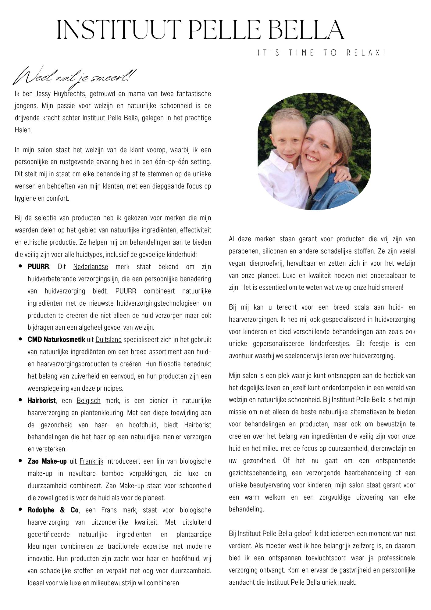 Bij Instituut Pelle Bella draait alles om jouw welzijn. Ik help je graag met behandelingen en producten die helemaal passen bij jouw wensen. Om iedereen de persoonlijke aandacht te kunnen geven die het verdient, werk ik uitsluitend op afspraak – dit geldt ook voor het ophalen van producten en cadeaubonnen. Zo kan ik je op een rustige en persoonlijke manier helpen.